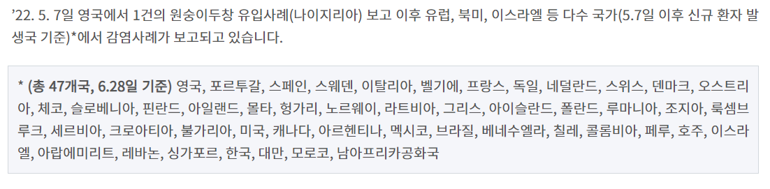 - 한국의 경우 2022년 6월 22일 원숭이두창 첫 환자가 발생한 뒤 73일만에 2022년 9월 현재 2명의 원숭이 두창 환자가 발생했습니다. 증상 경증에 해당되고 큰 무리는 없다고 합니다.