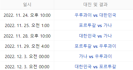 - 대한민국 조편성 : H조 (포르투갈, 가나, 우루과이, 대한민국)